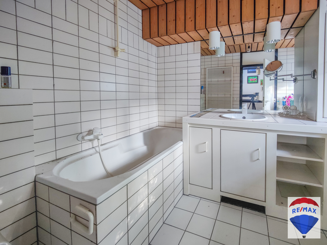 Der Boden wurde hier mit Teppichboden bestückt. Die dreiseitig integrierte Einbauküche ist im Kaufpreis enthalten. Das weiß geflieste Badezimmer wurde folgendermaßen ausgestattet: WC, Handwaschbecken, Badmöbel und Badewanne. Über eine imposante, dunkle Holztreppe gelangen Sie ins Dachgeschoss. Hier befindet sich ein großer Studiobereich. Die große Fensterfront verleihen diesem Raum eine besondere Atmosphäre und lässt ihn hell und freundlich erstrahlen. Auf dieser 4. Ebene befindet sich die große Außenterrasse.